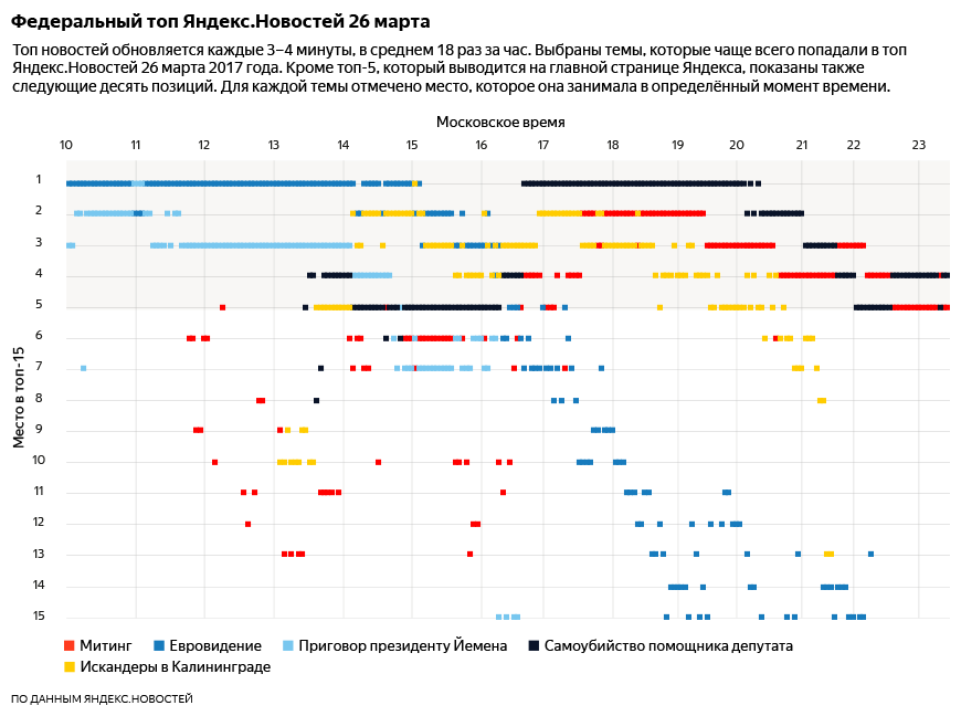 Как отметили представители сервиса, в момент начала акции, которая стартовала на Дальнем Востоке, ее освещали далеко не все СМИ. В результате в первой половине дня сюжеты формировались лишь из сообщений небольших источников, и их общего веса не хватало, чтобы вынести тему в топ-5. Позднее различные новости, связанные с антикоррупционными митингами, периодически отображались на главной странице "Яндекса" (время их появления можно увидеть на графике), но вытеснялись оттуда сюжетами с большим весом. При этом в сообщении отмечается, что вес других сюжетов мог быть завышен из-за недобросовестной оптимизации, с которой борется агрегатор.